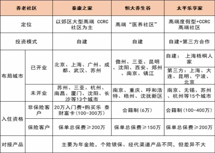 盡管泰康、太平、太保、國(guó)壽、合眾等公司均在積極布局養(yǎng)老社區(qū),其在養(yǎng)老社區(qū)的定位、投資模式、運(yùn)營(yíng)方式、入住方式等方面卻各有異同。
