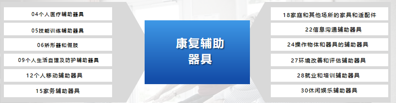 個(gè)人生活自理及防護(hù)輔助器具、個(gè)人移動(dòng)輔助器具、家庭和其他場(chǎng)所的家具和適配件、信息溝通輔助器具、個(gè)人醫(yī)療輔助器具、休閑娛樂(lè)輔助器具。