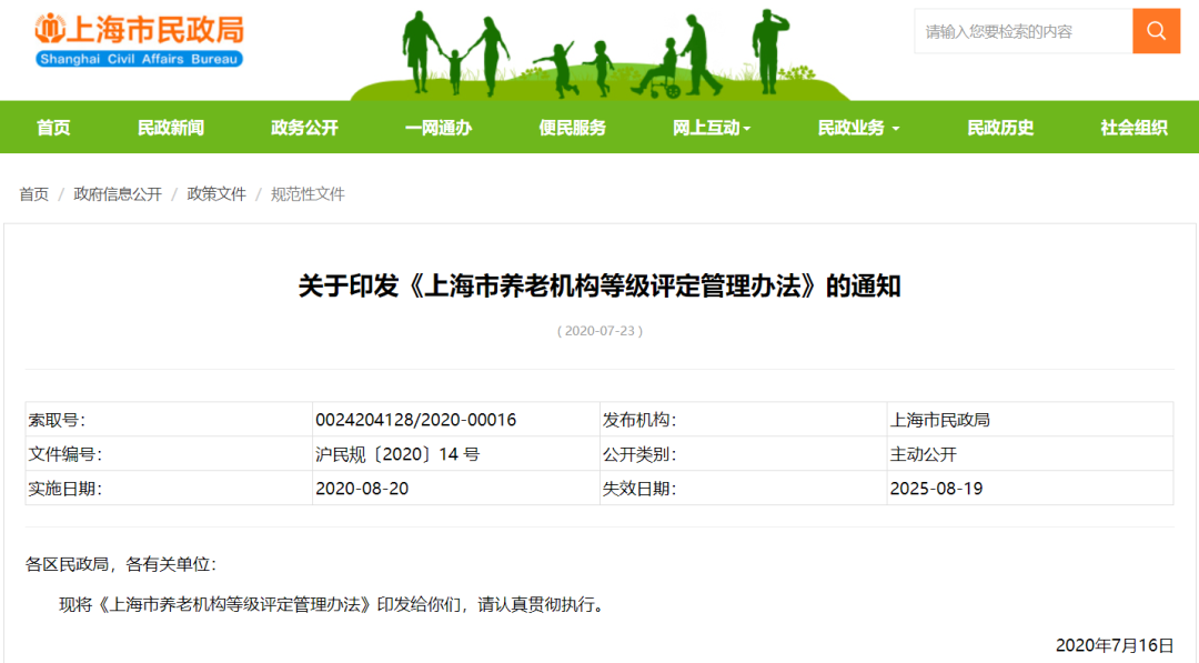 7月23日,上海市民政局印發(fā)了《上海市養(yǎng)老機(jī)構(gòu)等級(jí)評(píng)定管理辦法》,今年8月20日起實(shí)施。