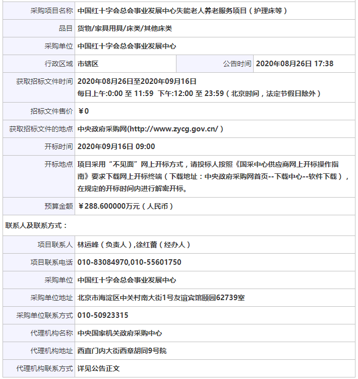 項目名稱:中國紅十字會總會事業(yè)發(fā)展中心失能老人養(yǎng)老服務(wù)項目(護理床等)