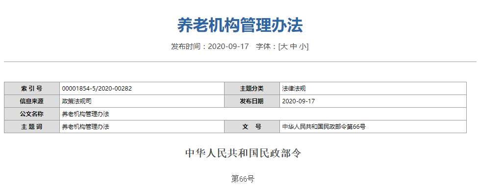 據(jù)民政部官網(wǎng)消息,《養(yǎng)老機(jī)構(gòu)管理辦法》已經(jīng)2020年8月21日民政部部務(wù)會(huì)議通過(guò),現(xiàn)予公布,自2020年11月1日起施行。