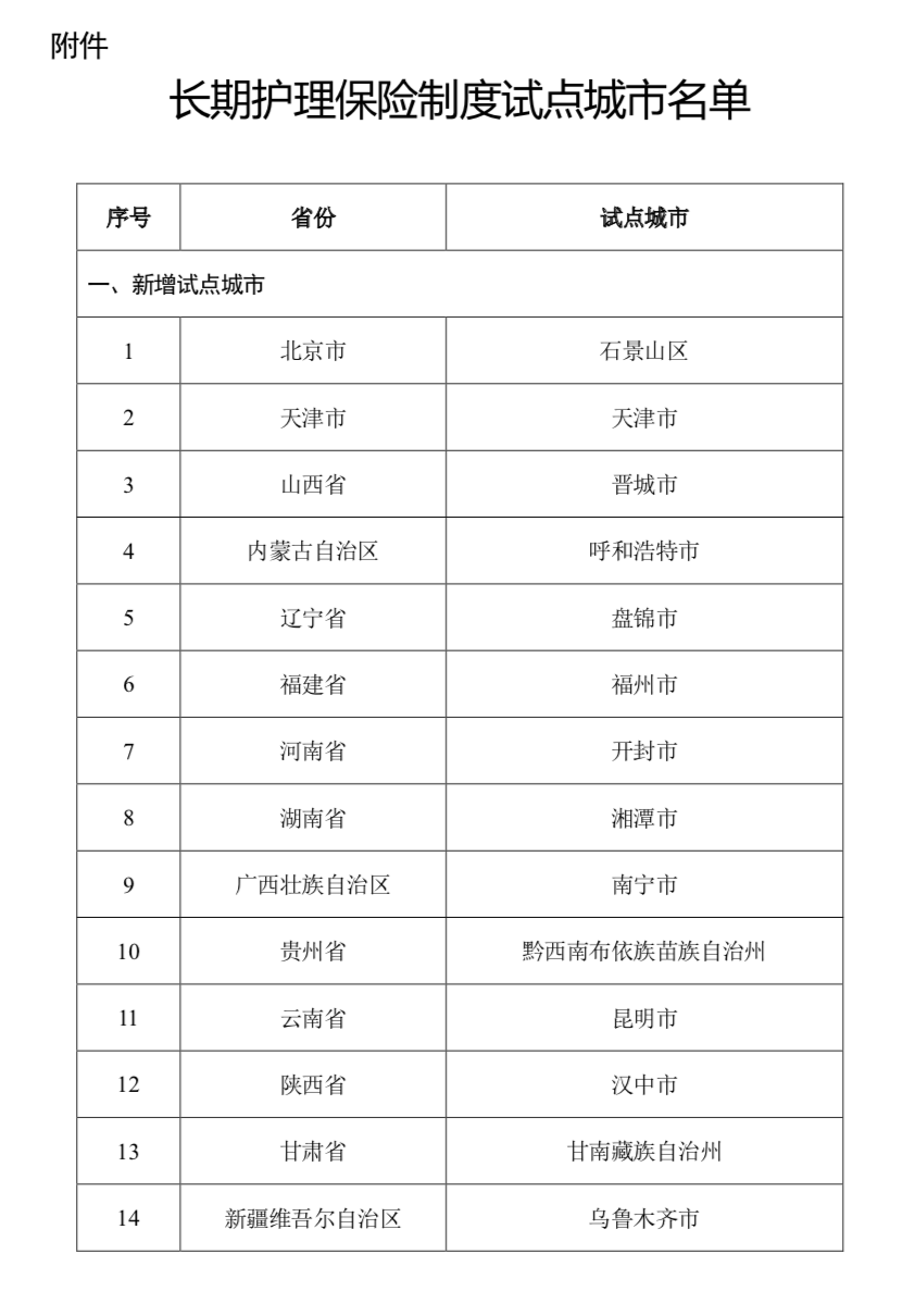 附件:長期護理保險制度試點城市名單