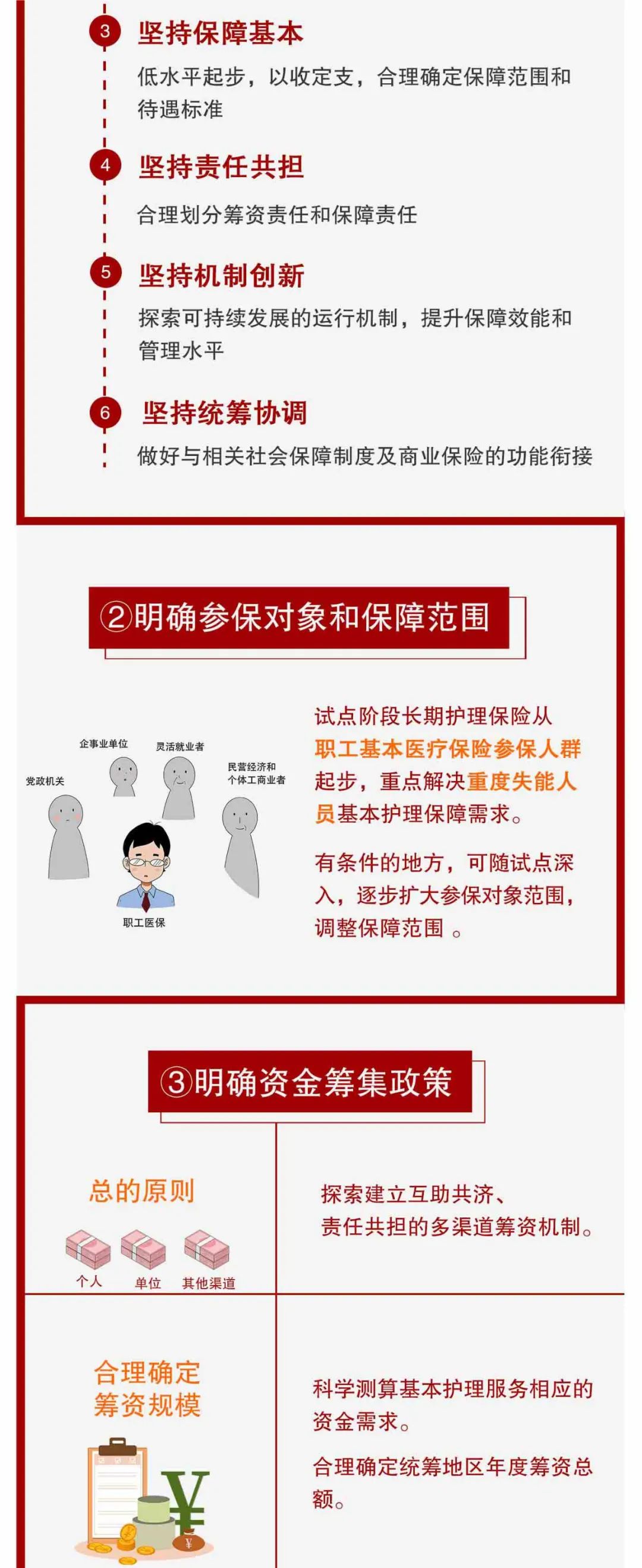 (二)基本原則。堅持以人為本,重點解決重度失能人員長期護理保障問題。堅持獨立運行,著眼于建立獨立險種,獨立設(shè)計、獨立推進。堅持保障基本,低水平起步,以收定支,合理確定保障范圍和待遇標(biāo)準(zhǔn)。堅持責(zé)任共擔(dān),合理劃分籌資責(zé)任和保障責(zé)任。堅持機制創(chuàng)新,探索可持續(xù)發(fā)展的運行機制,提升保障效能和管理水平。堅持統(tǒng)籌協(xié)調(diào),做好與相關(guān)社會保障制度及商業(yè)保險的功能銜接。