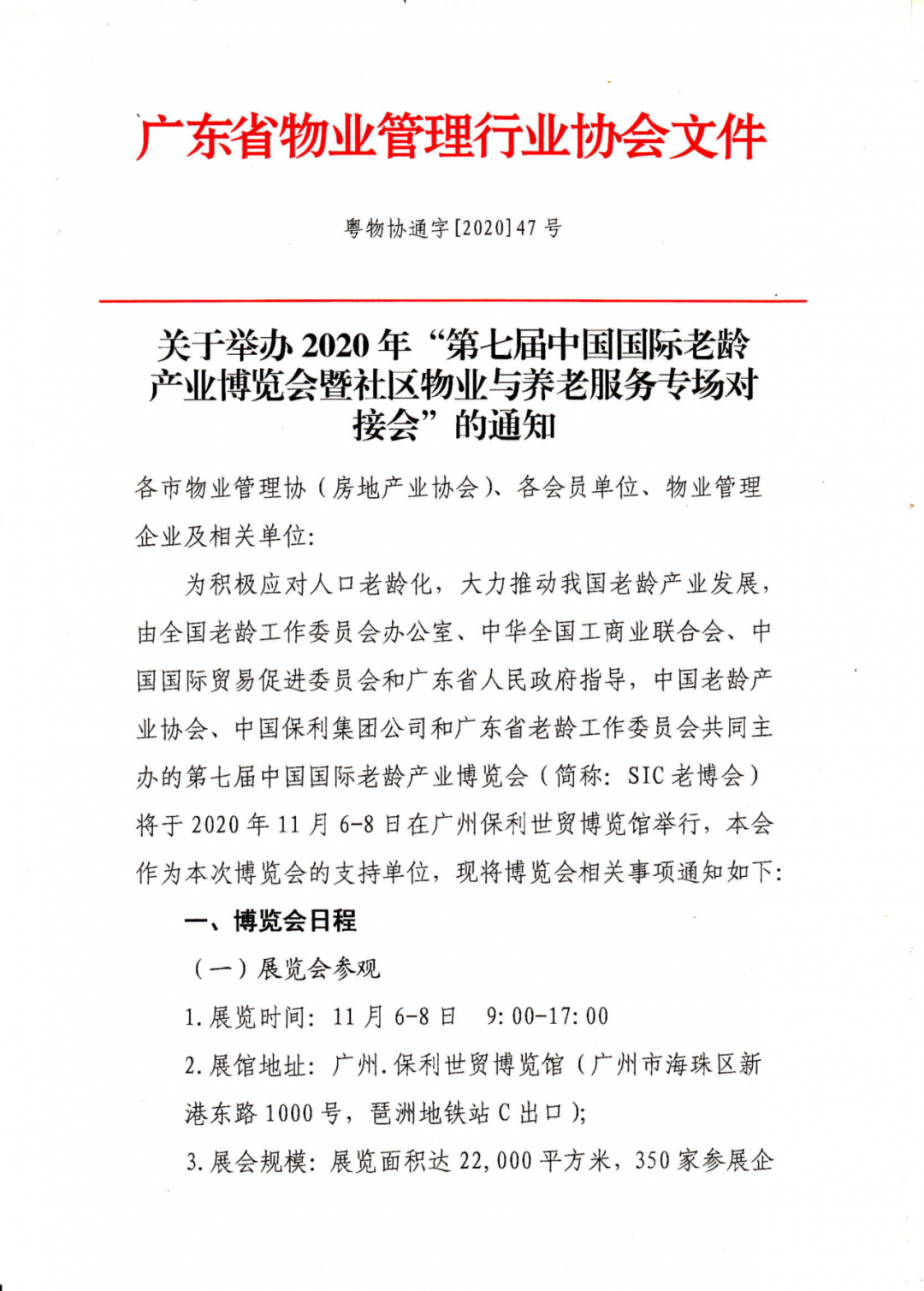 為積極應(yīng)對(duì)人口老齡化,充分發(fā)揮地產(chǎn)物業(yè)在養(yǎng)老體系中的作用,搭建物業(yè)社區(qū)居家養(yǎng)老服務(wù)行業(yè)交流平臺(tái),進(jìn)一步促進(jìn)地產(chǎn)物業(yè)、社區(qū)物業(yè)與養(yǎng)老設(shè)施部品企業(yè)、康復(fù)護(hù)理企業(yè)、養(yǎng)老運(yùn)營(yíng)服務(wù)商等的供需對(duì)接與交流合作,廣東省物業(yè)管理行業(yè)協(xié)會(huì)、中國(guó)國(guó)際老齡產(chǎn)業(yè)博覽會(huì)組委會(huì)將于2020年11月6日上午舉辦“社區(qū)物業(yè)與養(yǎng)老服務(wù)專場(chǎng)對(duì)接會(huì)”,歡迎報(bào)名參會(huì)!對(duì)接會(huì)安排如下: