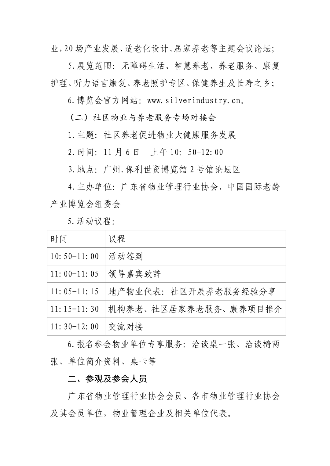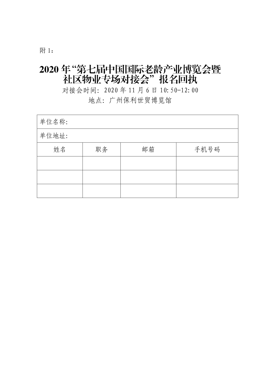 請(qǐng)于10月20日前填報(bào)附件《第七屆中國(guó)國(guó)際老齡產(chǎn)業(yè)博覽會(huì)暨社區(qū)物業(yè)專場(chǎng)對(duì)接會(huì)報(bào)名回執(zhí)》(點(diǎn)擊本文左下角【閱讀原文】,即可下載附件),大會(huì)將有專人聯(lián)系安排對(duì)接會(huì)籌備事項(xiàng)。