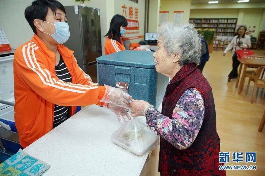 (廣州市越秀區(qū)六榕街長(zhǎng)者綜合服務(wù)中心的長(zhǎng)者食堂,一位老人把飯菜打包回家。圖源:新華網(wǎng))