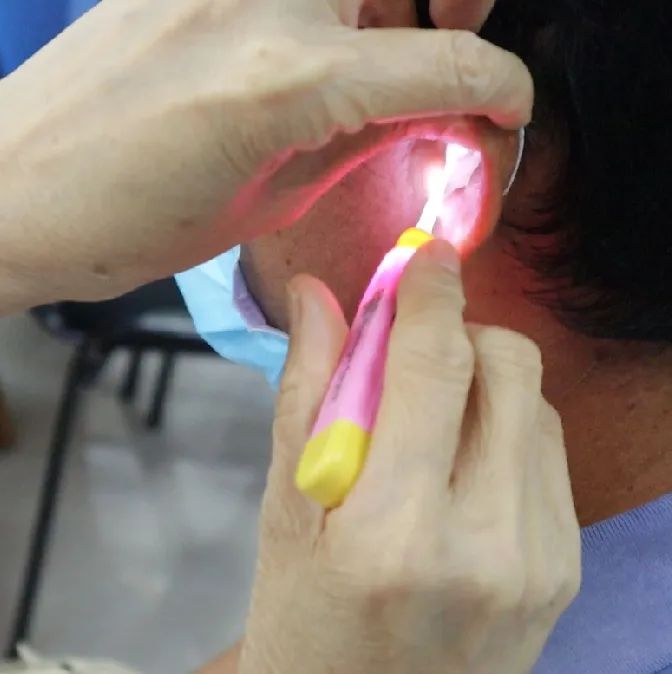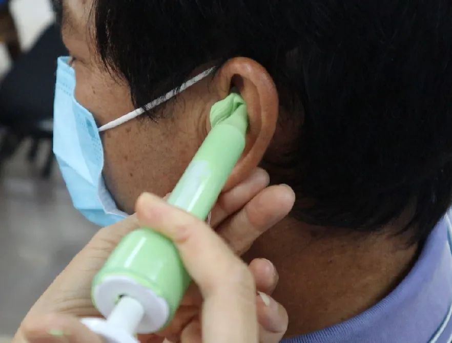 ②用特定針筒,將耳膜材料注入耳朵