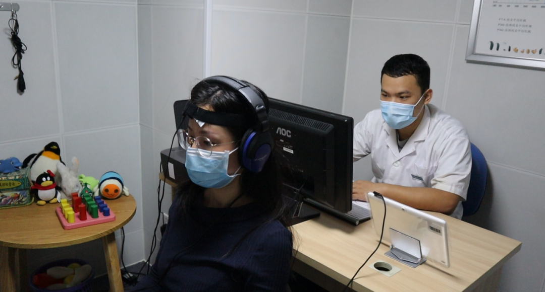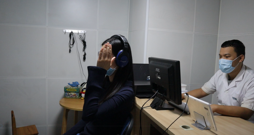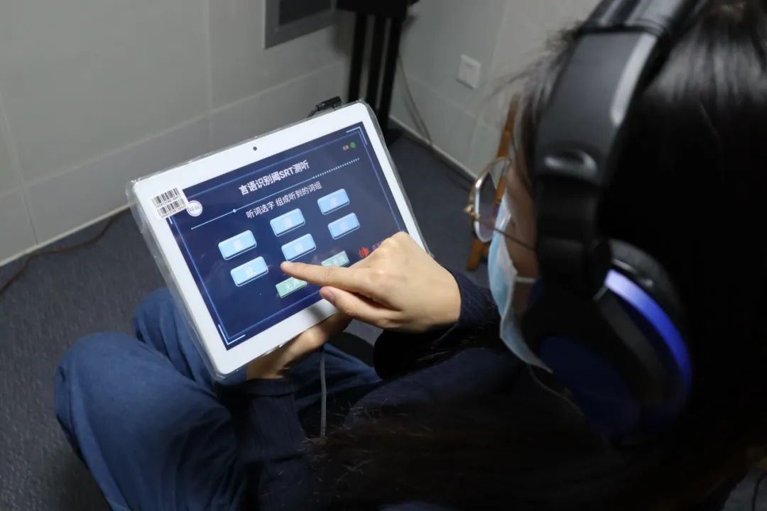 在驗(yàn)配師的指導(dǎo)下,長(zhǎng)者可以在耳鳴測(cè)聽與治療室自己進(jìn)行耳鳴測(cè)試。戴上測(cè)聽耳機(jī),根據(jù)聽到的聲音在平板電腦上點(diǎn)擊選項(xiàng),耳鳴測(cè)聽的過(guò)程就是如此簡(jiǎn)單。