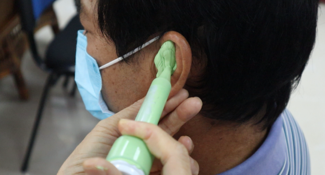 試戴耳樣,確認(rèn)舒適度后,就可以制作助聽器了。除外殼外助聽器還會(huì)配備遙控器,便于控制。