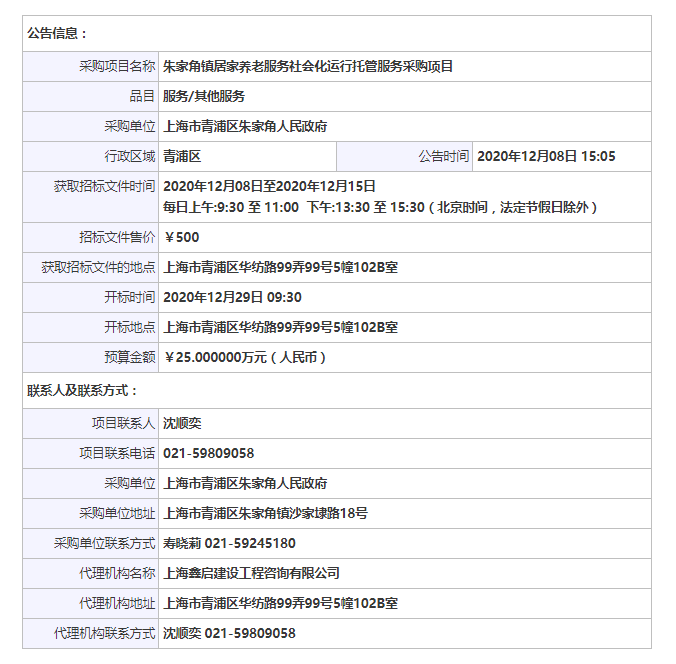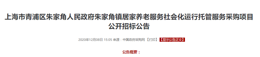 項(xiàng)目名稱:上海市青浦區(qū)朱家角人民政府朱家角鎮(zhèn)居家養(yǎng)老服務(wù)社會(huì)化運(yùn)行托管服務(wù)采購項(xiàng)目公開招標(biāo)公告