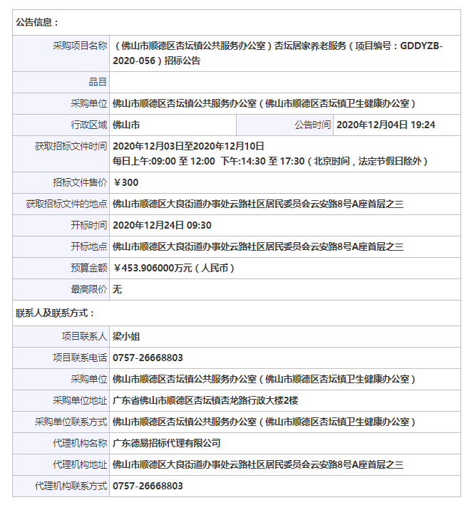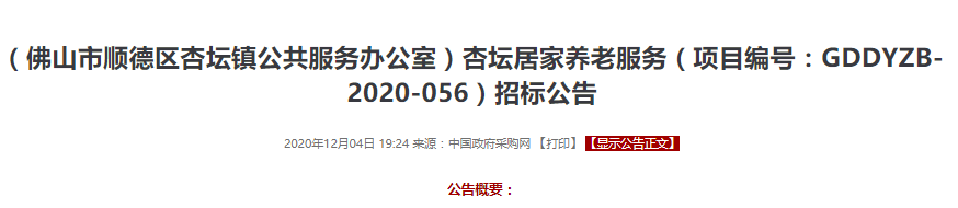 項(xiàng)目名稱:(佛山市順德區(qū)杏壇鎮(zhèn)公共服務(wù)辦公室)杏壇居家養(yǎng)老服務(wù)(項(xiàng)目編號(hào):GDDYZB-2020-056)招標(biāo)公告
