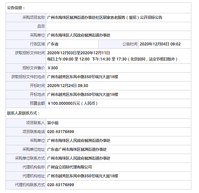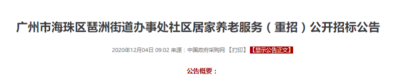 項(xiàng)目名稱:廣州市海珠區(qū)琶洲街道辦事處社區(qū)居家養(yǎng)老服務(wù)(重招)公開招標(biāo)公告