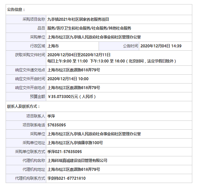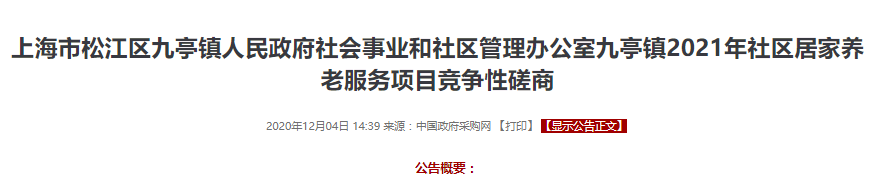 項(xiàng)目名稱:上海市松江區(qū)九亭鎮(zhèn)人民政府社會(huì)事業(yè)和社區(qū)管理辦公室九亭鎮(zhèn)2021年社區(qū)居家養(yǎng)老服務(wù)項(xiàng)目競(jìng)爭(zhēng)性磋商
