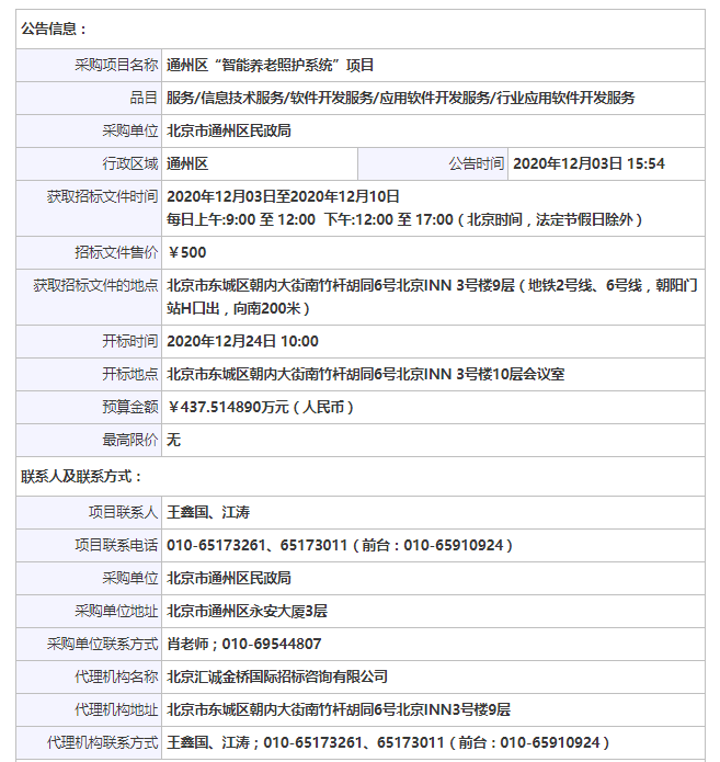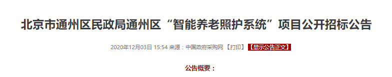 項(xiàng)目名稱:北京市通州區(qū)民政局通州區(qū)“智能養(yǎng)老照護(hù)系統(tǒng)”項(xiàng)目公開招標(biāo)公告