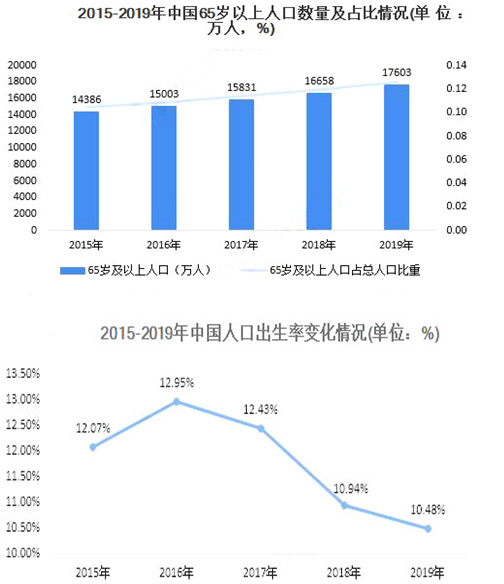 目前,我國(guó)的老年人口數(shù)量持續(xù)上升、人口出生率持續(xù)降低,人口老齡化趨勢(shì)較為明顯。數(shù)據(jù)顯示,2019年,我國(guó)65歲以上人口數(shù)量為1.76億人,占總?cè)丝诒戎?2.57%,這一比例相較于2018年提升0.64個(gè)百分點(diǎn)。同年,人口出生率下為10.48%,較2018年下降0.46個(gè)百分點(diǎn)。