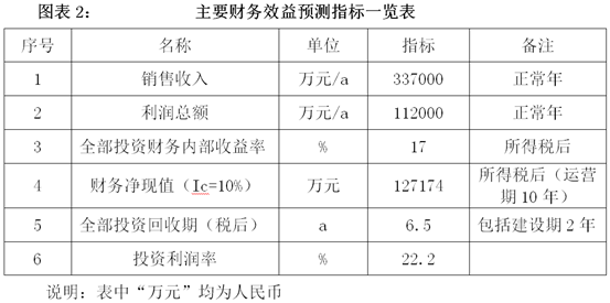 項(xiàng)目達(dá)產(chǎn)后,年銷售收入337000萬元,利潤(rùn)112000萬元,投資回收期6.5年(稅后,含建設(shè)期2年),投資利潤(rùn)率22.2%。