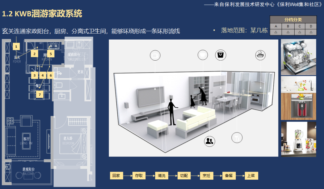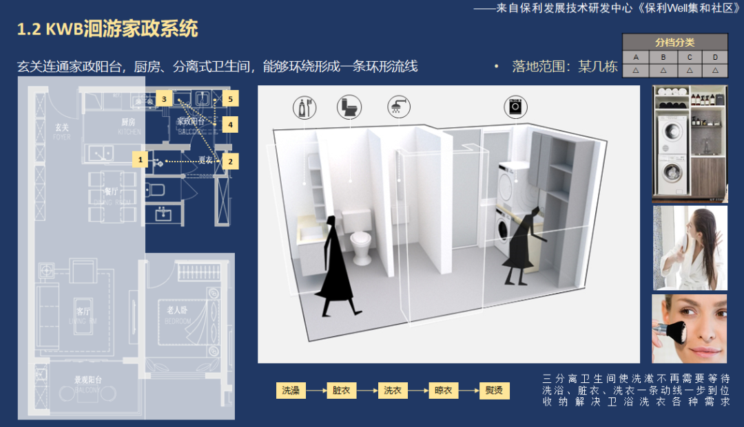 在室內(nèi)居住空間方面,要設(shè)計老人房,實現(xiàn)和年輕人的動靜分區(qū)。室內(nèi)設(shè)計上,可以讓玄關(guān)連通陽臺、廚房、分離式衛(wèi)生間,能夠形成一條環(huán)形流線,讓老年人在烹飪、沐浴、洗衣、晾曬的行走路線更短,而不用繞行家庭公共空間,一定程度上也保護了老年人的隱私。
