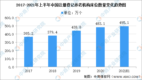 我國養(yǎng)老機(jī)構(gòu)規(guī)模擴(kuò)大,養(yǎng)老機(jī)構(gòu)床位數(shù)也隨之增加。2020年全國注冊(cè)登記的養(yǎng)老機(jī)構(gòu)床位數(shù)483.1萬張,2021年上半年全國注冊(cè)登記的養(yǎng)老機(jī)構(gòu)床位數(shù)495.1萬張。