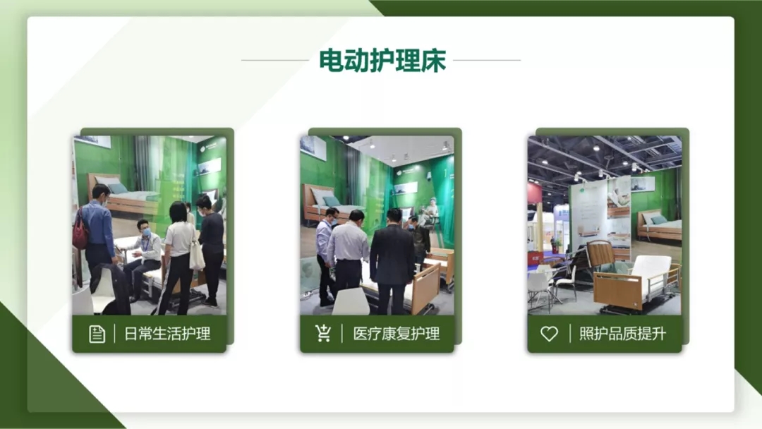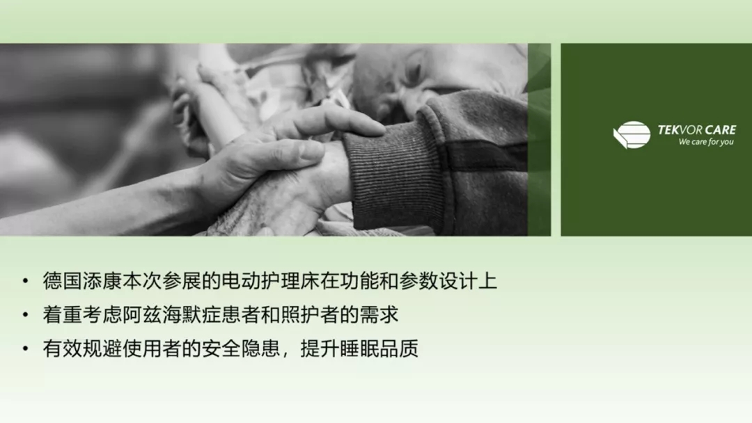 德國添康盛裝亮相此次展會,同時展示了主推產(chǎn)品。德國添康擁有30年專業(yè)設(shè)計(jì)生產(chǎn)電動護(hù)理床的經(jīng)驗(yàn),同時獲得多項(xiàng)國內(nèi)外專利,其家居溫馨的精致設(shè)計(jì)和醫(yī)用級的品質(zhì)體驗(yàn)備受參展觀眾的青睞,吸引了眾多觀眾前來咨詢。