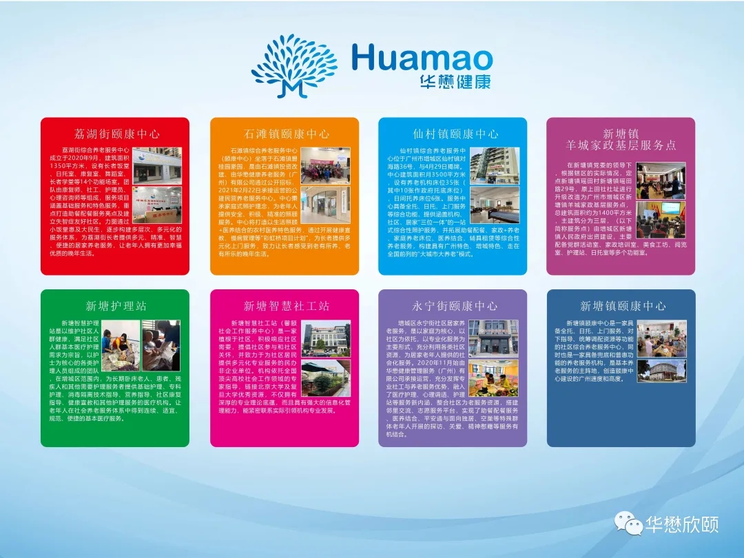 AS:是的,華懋健康集團2014年在上海市科委直屬科創(chuàng)中心成立。旗下上海華懋信息技術有限公司是一家智慧康養(yǎng)的創(chuàng)新科技企業(yè),主營業(yè)務是以“互聯(lián)網+養(yǎng)老”為基礎的各類養(yǎng)老服務相關的信息化平臺產品及應用。2020年,在廣州政策及政府邀請下,在廣州成立了華懋健康養(yǎng)老服務“廣州”有限公司,在廣州市領導、市民政局的推進下在廣州增城新塘鎮(zhèn)落地運營了第一家頤康中心。到2021年10月,先后在廣州增城石灘鎮(zhèn)、永寧街、荔湖街、仙村鎮(zhèn)開設頤康中心、頤康服務站。