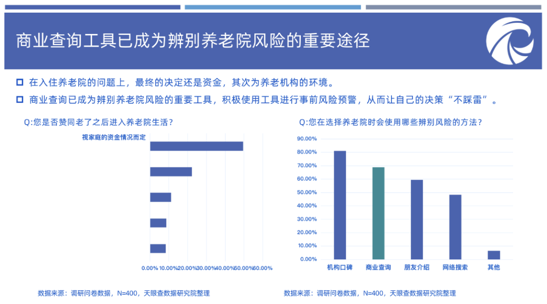 掌握更全面的信息,降低養(yǎng)老決策的風險,顯得十分重要。報告調研數(shù)據(jù)顯示,在選擇養(yǎng)老院時,超6成用戶都會使用諸如天眼查等商業(yè)查詢工具查詢機構資質,輔助決策;超6成人員對未來養(yǎng)老資金存在擔心,但僅有1成不到的人對現(xiàn)行社會保險體制及其相關政策“非常了解”。