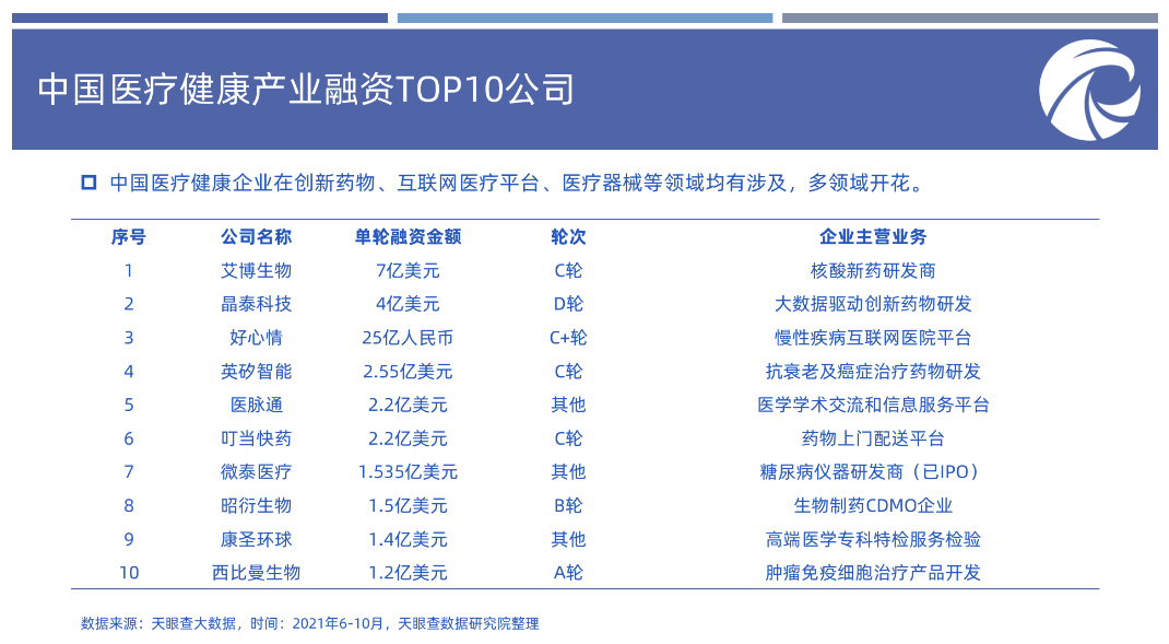 截至2021年9月,中國共有52家醫(yī)療健康企業(yè)登上“全球獨角獸企業(yè)500強”榜,數(shù)量位居全球第二。醫(yī)療健康企業(yè)具備較強吸金能力,2021年6月-10月,融資TOP10公司單輪融資金額就高達48.585億美元。中國醫(yī)療健康企業(yè)總估值達2176.82億美元,較2020年上漲661.67億美元?;ヂ?lián)網(wǎng)大廠對醫(yī)療健康賽道也有超高熱情,投資構建了相對完整的醫(yī)療健康版圖,并互有差異化。