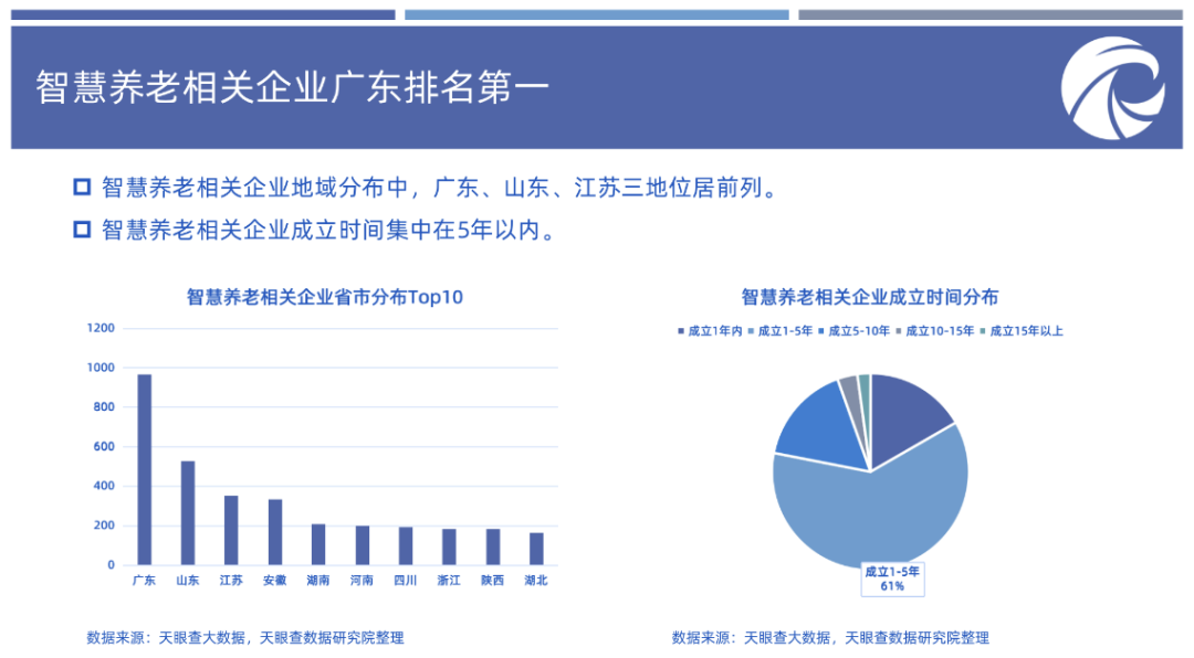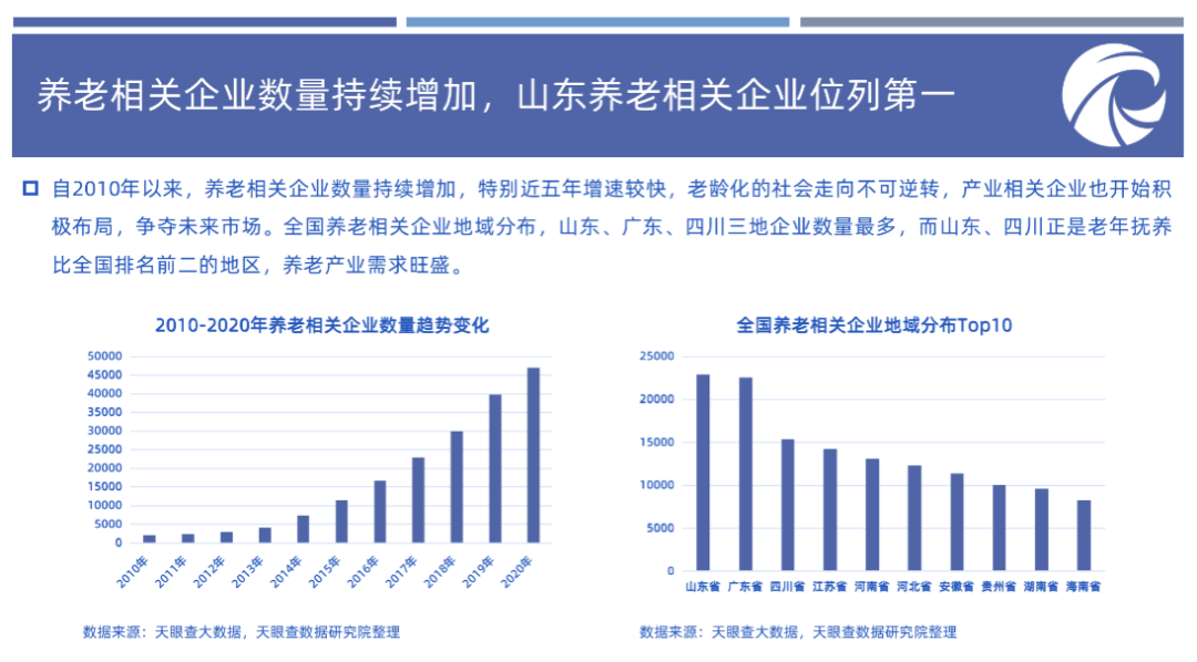近日,天眼查聯(lián)合百度財經(jīng)發(fā)布《大健康時代新機遇:未來生活的前置思考》報告(以下簡稱“報告”)。報告顯示,在各界推動下,我國健康、養(yǎng)老行業(yè)發(fā)展活力快速釋放,醫(yī)療健康賽道2021年獨角獸數(shù)量就居全球第二;如今養(yǎng)老相關企業(yè)數(shù)量共計超過23萬家,養(yǎng)老產(chǎn)業(yè)近5年融資達60億,智慧養(yǎng)老企業(yè)數(shù)量達5300余家。養(yǎng)老企業(yè)數(shù)量最多的四大地域為山東、廣東、四川、江蘇;養(yǎng)老院數(shù)量方面北京、河南、江蘇、湖南位居前例;廣東智慧養(yǎng)老企業(yè)數(shù)量最多。