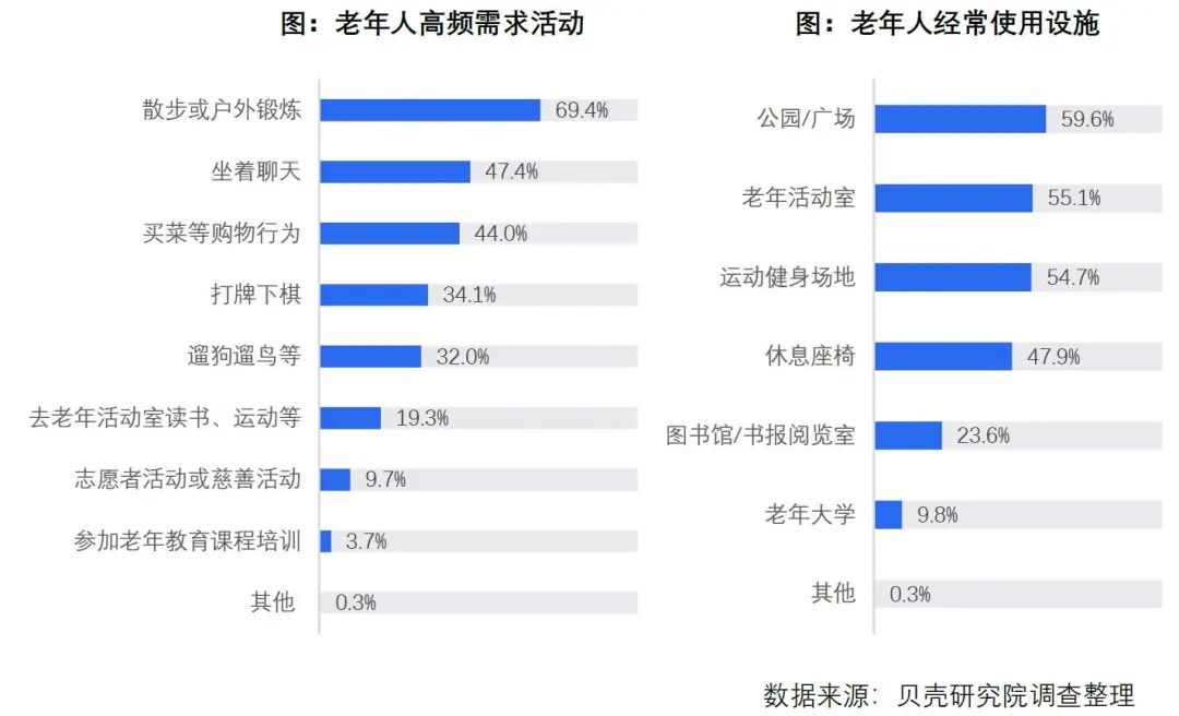 貝殼研究院在“分鐘城”系列專題之老年社區(qū)的調(diào)研中顯示,老年人出行頻率并不低,近8成受訪者在社區(qū)內(nèi)或附近活動(dòng)的頻率為一天一次或一天多次。老年人對(duì)公共服務(wù)設(shè)施有多元化需求,戶外活動(dòng)占比最高,69.4%的老年群體曾在社區(qū)及附近散步或戶外鍛煉;其次是休閑娛樂活動(dòng),為47.4%;再次是生活物料采買活動(dòng),為44%;此外,老年人對(duì)社區(qū)醫(yī)療服務(wù)項(xiàng)目的需求強(qiáng)烈,包括健康監(jiān)測、送醫(yī)拿藥、家庭醫(yī)生等。