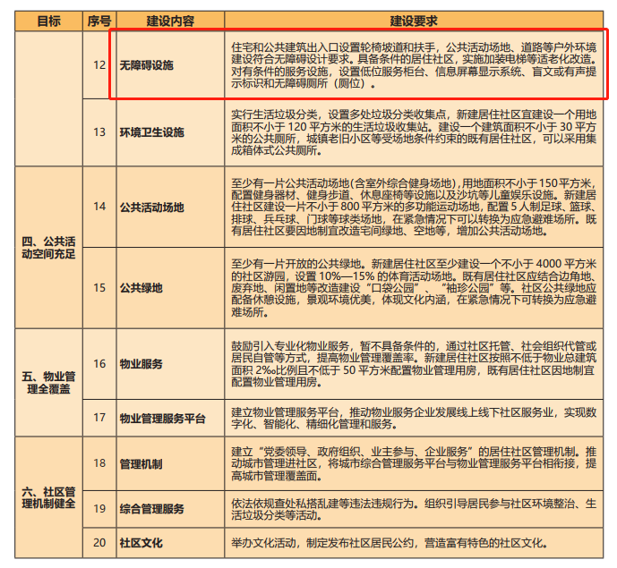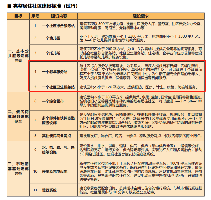 為指導(dǎo)各地統(tǒng)籌推進完整居住社區(qū)建設(shè)工作,近日住房和城鄉(xiāng)建設(shè)部辦公廳制定了《完整居住社區(qū)建設(shè)指南》,對相關(guān)基礎(chǔ)設(shè)施建設(shè)和完整居住社區(qū)的規(guī)模方面作出具體要求: