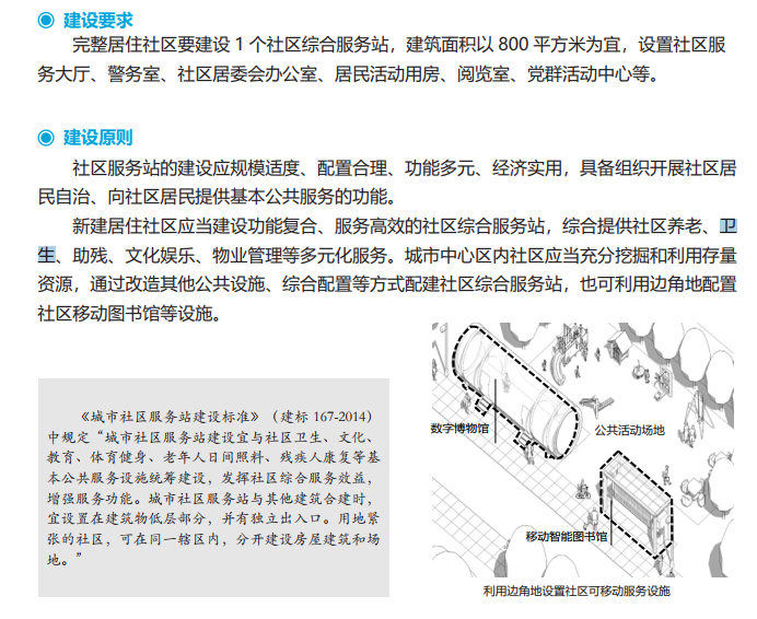 要求各地應(yīng)根據(jù)兒童、老年人等社區(qū)居民的步行能力、基本服務(wù)設(shè)施的服務(wù)能力以及社區(qū)綜合管理能力等,合理確定完整居住社區(qū)規(guī)模;以居民步行5~10分鐘到達幼兒園、老年服務(wù)站等社區(qū)基本公共服務(wù)設(shè)施為原則;以城市道路網(wǎng)、自然地形地貌和現(xiàn)狀居住小區(qū)等為基礎(chǔ),與社區(qū)居民委員會管理和服務(wù)范圍相對接,因地制宜合理確定居住社區(qū)規(guī)模;原則上單個居住社區(qū)以0.5萬~1.2萬人口規(guī)模為宜。