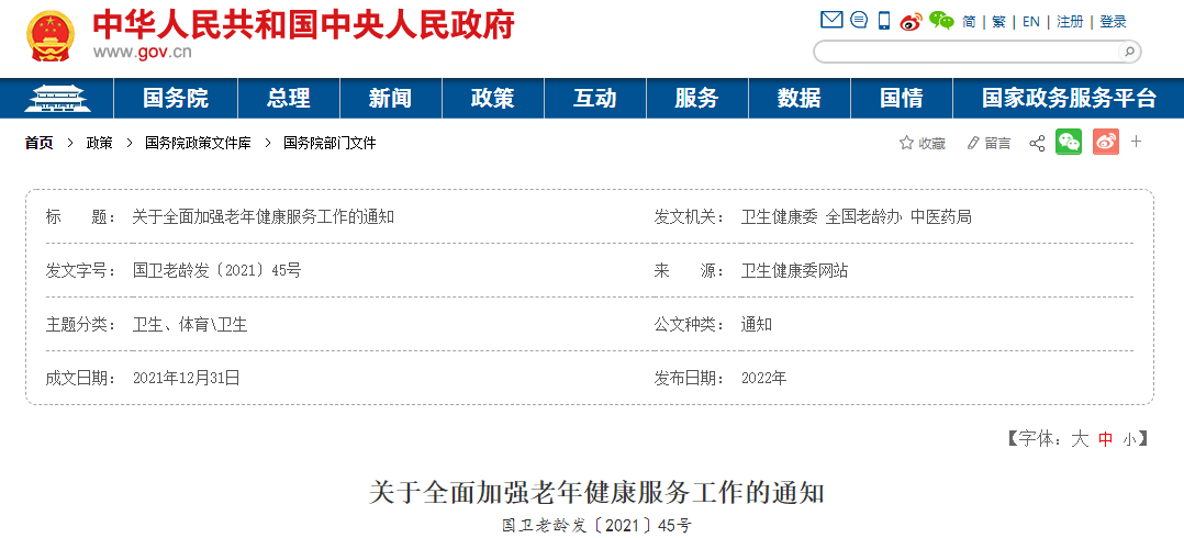 為貫徹落實全國老齡工作會議精神,協(xié)同推進健康中國戰(zhàn)略和積極應(yīng)對人口老齡化國家戰(zhàn)略,持續(xù)增加老年健康服務(wù)供給,切實提高老年健康服務(wù)質(zhì)量,不斷滿足老年人的健康服務(wù)需求,現(xiàn)就全面加強老年健康服務(wù)工作通知如下: