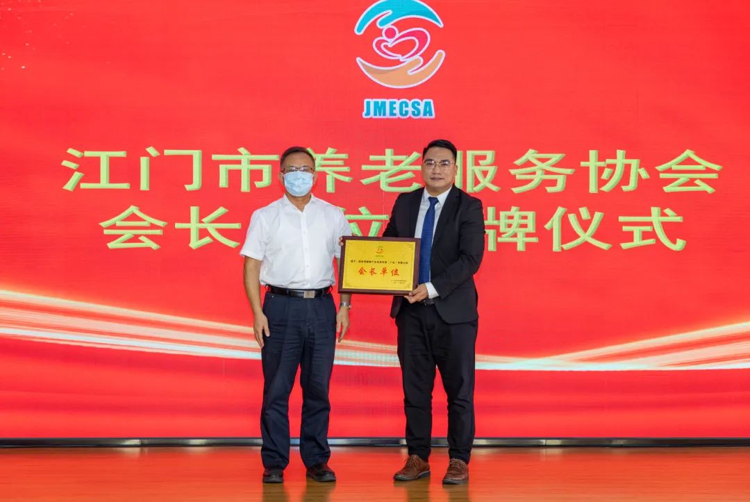 ▲江門市民政局黨組書記、局長(zhǎng)謝鴻猷為當(dāng)選會(huì)長(zhǎng)單位頒發(fā)牌匾