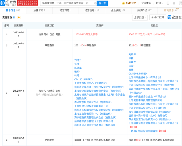 企查查APP顯示,7月19日,福壽康智慧(上海)醫(yī)療養(yǎng)老服務(wù)有限公司發(fā)生工商變更,新增股東廣西騰訊創(chuàng)業(yè)投資有限公司,同時(shí)公司注冊(cè)資本由1165.94萬元人民幣增加至1346.35萬元人民幣,增幅15.47%。企查查信息顯示,福壽康是一家居家養(yǎng)老護(hù)理服務(wù)商,其公司成立于2011年,法定代表人為張軍,經(jīng)營范圍包含:為老年人提供社區(qū)托養(yǎng)、居家照護(hù)等社區(qū)養(yǎng)老服務(wù),家政服務(wù)等。