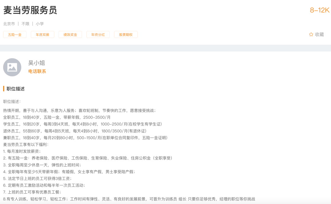 其中,在一則麥當(dāng)勞服務(wù)員招聘需求中可以看到,北京一麥當(dāng)勞可招收退休人員做服務(wù)員,要求女50歲、男60歲以上(需要退休證),實行彈性工作制,每周上4到5天班,每天4到8小時,每月工資在1800/3500元。