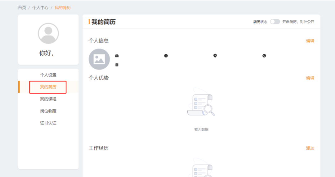 但是,如何在網(wǎng)站上發(fā)布自己的求職信息呢?需要點開個人中心,側(cè)邊欄有個“我的簡歷”,可以填寫求職信息。