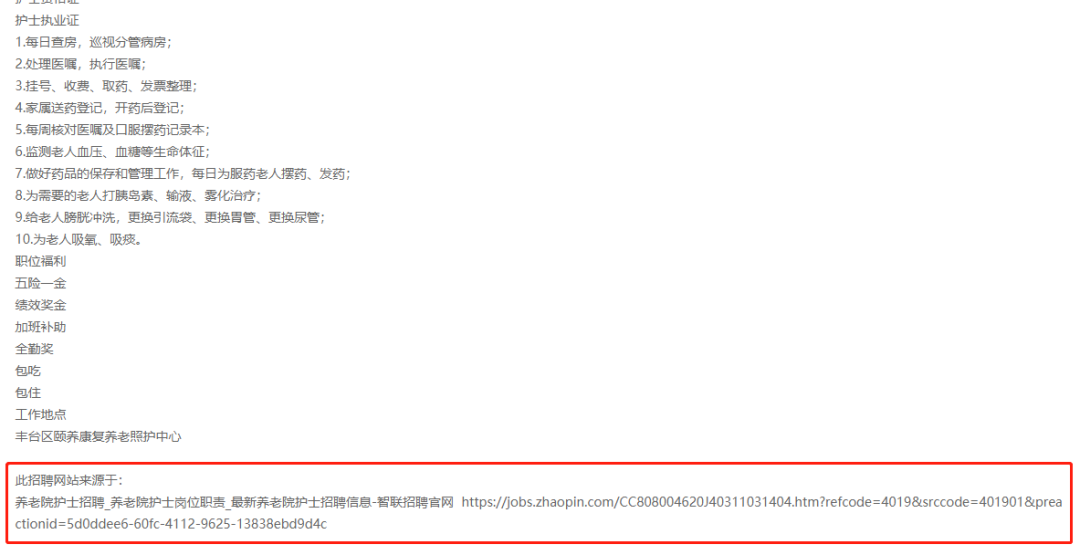 職位描述最后都標明了該職位的網(wǎng)站來源。所以該網(wǎng)站目前是將智聯(lián)招聘、58同城等招聘網(wǎng)站上適合老年人的工作進行了資源整合,期待網(wǎng)站未來可以提供一些獨家崗位。