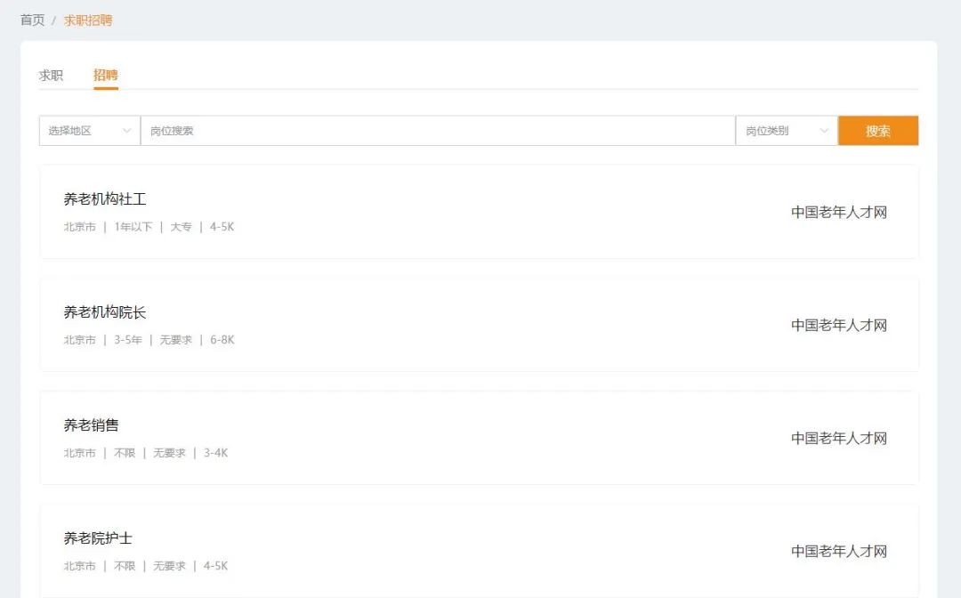 最受關(guān)注的應(yīng)該是“求職招聘”板塊,目前網(wǎng)站共掛出了總計81個北京的崗位,包括養(yǎng)老院院長、養(yǎng)老銷售、養(yǎng)老院護士、社工等,薪資在3k-30k不等。