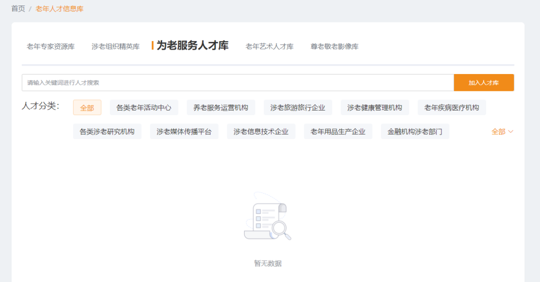 該信息庫是面向全國老年人才、為老服務(wù)機構(gòu)、各地用人單位的專業(yè)信息服務(wù)平臺,具體包含老年人才庫、老齡人力資源庫、為老服務(wù)人才庫、涉老組織精英庫、老齡才藝人才庫、尊老敬老影像庫,既包括學(xué)術(shù)界的研究型人才,也包括產(chǎn)業(yè)界的實用型人才。老年人才信息庫與各地老年人才信息庫數(shù)據(jù)鏈接。