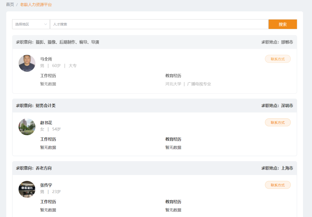 在老齡人力資源平臺,已經(jīng)能看到一千多條求職者的信息,包括性別、年齡、求職意向、求職地點、工作經(jīng)歷、畢業(yè)院校等。最小的求職者23歲,最大的63歲,以40-60歲居多。