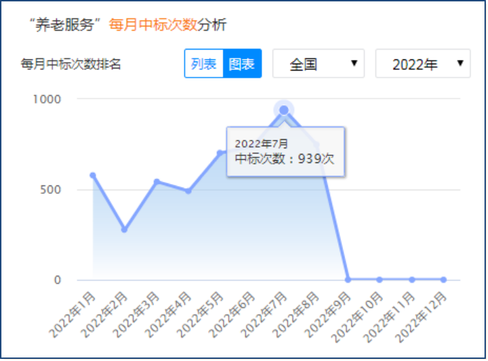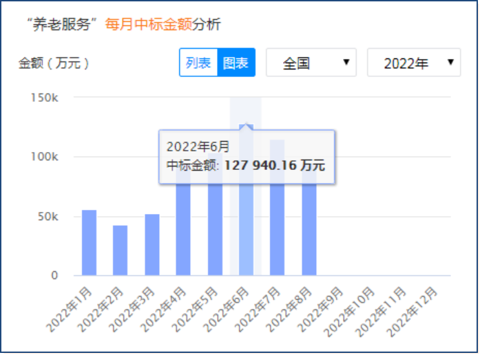 目前,隨著我國人口老齡化問題的加劇,老年人口數(shù)量逐年上升,我國養(yǎng)老市場規(guī)模巨大,養(yǎng)老服務(wù)業(yè)發(fā)展?jié)摿κ?。養(yǎng)老行業(yè)整體呈現(xiàn)上升趨勢,未來前景十分可觀。下面我們來看一下2022年“養(yǎng)老服務(wù)”的招投標市場情況。本文通過采招網(wǎng)上歷年來“養(yǎng)老服務(wù)”的招投標數(shù)據(jù),從采購熱點地區(qū)、重點業(yè)主單位、代理機構(gòu)、中標趨勢、中標企業(yè)等幾個維度入手,分析了“養(yǎng)老服務(wù)”今年上半年整體的招投標情況。