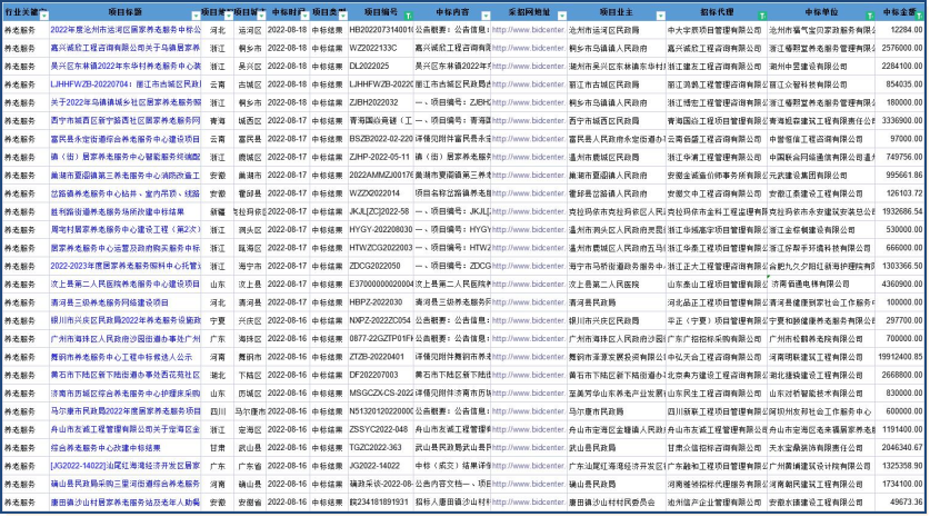 項目列表中,標題含有“養(yǎng)老服務(wù)”這個關(guān)鍵詞的招標公告和中標結(jié)果信息。采招網(wǎng)—數(shù)據(jù)中心,可以將近10年的歷史招投標數(shù)據(jù)進行結(jié)構(gòu)化的整理??赏ㄟ^API接口、EXCEL報表、數(shù)據(jù)庫的形式進行調(diào)用,表格字段包含:行業(yè)關(guān)鍵詞、信息標題、所在省市、預(yù)算金額、資金來源、業(yè)主單位、中標單位、中標金額、項目類型、招標編號、招標方式、評標方法、時間、信息鏈接等。