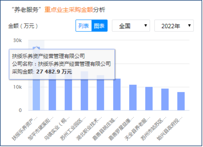 2022年上半年“養(yǎng)老服務(wù)”項目中,從采購次數(shù)前十的業(yè)主單位可以看出,招標頻率較高的業(yè)主單位有萬年縣民政局(招標72次)、蘭州市城關(guān)區(qū)民政局(招標30次)、蕪湖宜居養(yǎng)老服務(wù)有限公司(招標17次)等;從采購金額前十的業(yè)主單位來看,招標金額前三的業(yè)主單位有扶綏樂養(yǎng)資產(chǎn)經(jīng)營管理有限公司(27482.9萬元)、鄒平市黛溪街道辦事處(18454萬元)、烏鎮(zhèn)實業(yè)(桐鄉(xiāng))有限公司(17344.7萬元);