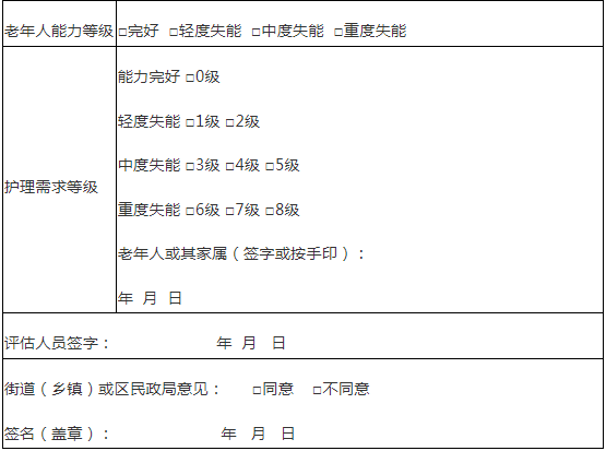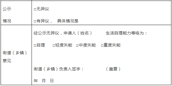 公示無異議的,由街道(鄉(xiāng)鎮(zhèn))在5個(gè)工作日內(nèi),在《北京市老年人能力評(píng)估工作表》簽署意見,形成評(píng)估結(jié)論。