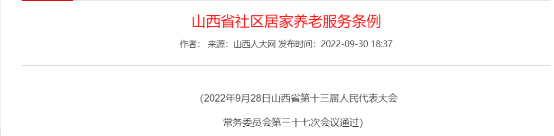 近日,《山西省社區(qū)居家養(yǎng)老服務(wù)條例》(以下簡(jiǎn)稱(chēng)《條例》)經(jīng)山西省十三屆人大常委會(huì)第三十七次會(huì)議審議通過(guò),將于2023年1月1日起施行。