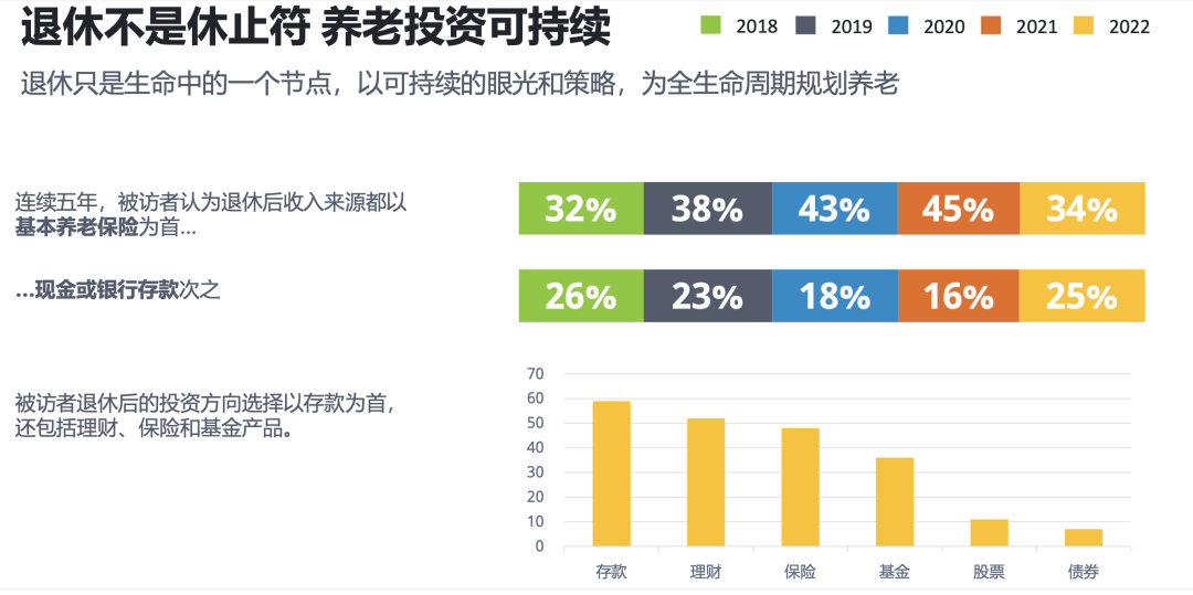 與此同時,今年的報告開始關注退休后的養(yǎng)老金提取和再投資問題。五年以來,受訪者以基本養(yǎng)老保險和現(xiàn)金作為退休后主要收入來源的趨勢還未完全轉變,人們尚未充分認識到退休后持續(xù)進行養(yǎng)老投資的重要性。不過,在已經持有養(yǎng)老目標基金的受訪者中,已有37%表示有意愿退休后繼續(xù)持有。