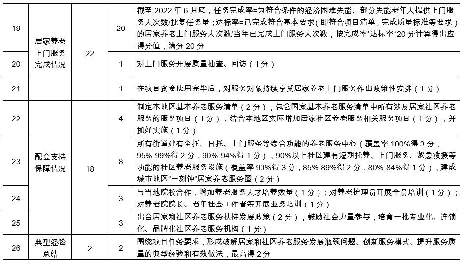 成果驗(yàn)收內(nèi)容主要包括項(xiàng)目組織管理、規(guī)范標(biāo)準(zhǔn)制定、資金管理、家庭養(yǎng)老床位建設(shè)、居家養(yǎng)老上門服務(wù)、配套支持保障、典型經(jīng)驗(yàn)總結(jié)等七方面情況。每項(xiàng)驗(yàn)收內(nèi)容細(xì)分為若干驗(yàn)收指標(biāo),并對應(yīng)相應(yīng)分值,形成《2021年居家和社區(qū)基本養(yǎng)老服務(wù)提升行動項(xiàng)目成果驗(yàn)收評價標(biāo)準(zhǔn)》(以下簡稱《驗(yàn)收評價標(biāo)準(zhǔn)》,見附件1)。