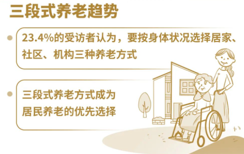 不同于傳統(tǒng)9073養(yǎng)老格局,中國城市居民養(yǎng)老方式并非一成不變,而是隨身體狀況變化呈現(xiàn)三段式養(yǎng)老人生:活力階段,超過一半(53.6%)選擇居家養(yǎng)老,并伴有明顯旅居意愿;半失能階段,居家養(yǎng)老仍是主流,但“社區(qū)養(yǎng)老”(36.3%)和“機(jī)構(gòu)養(yǎng)老”(21.1%)的比例有所提高;失能失智階段,機(jī)構(gòu)養(yǎng)老成為主流選擇。