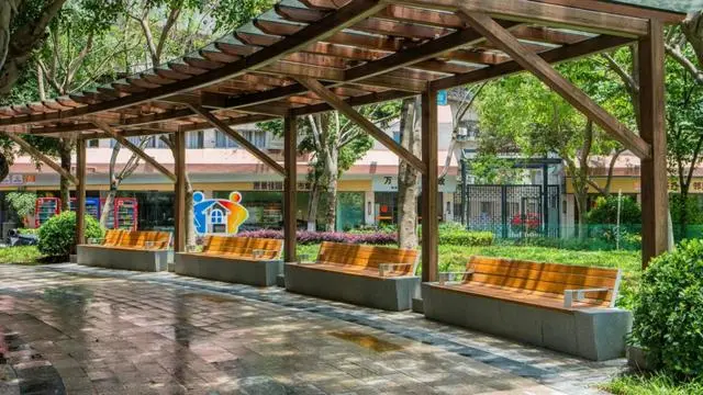 陳村社區(qū)適老化公園的休息區(qū)背后,就是鄰里中心
