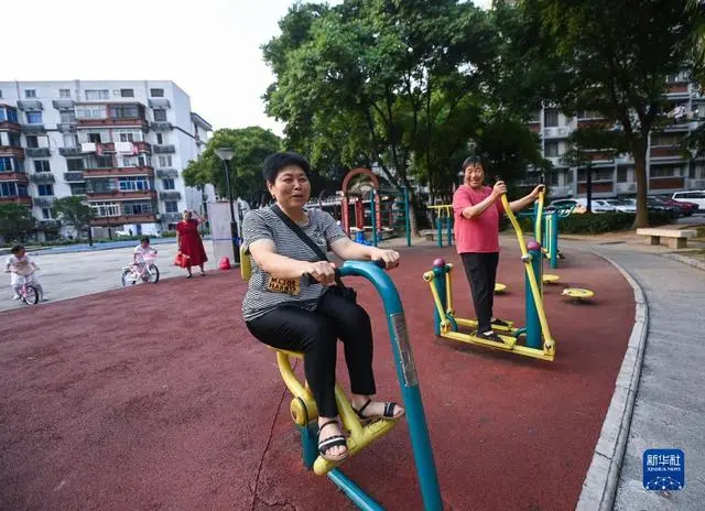 6月14日,在嘉興市南湖區(qū)新嘉街道電子社區(qū)內(nèi),老人們在進(jìn)行器械鍛煉。