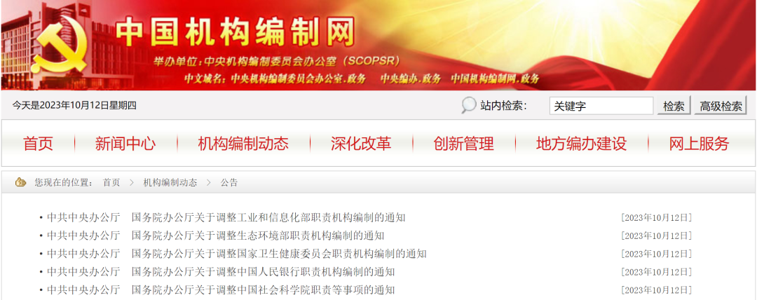 10月12日,中國(guó)機(jī)構(gòu)編制網(wǎng)接連發(fā)布五份中辦國(guó)辦通知,經(jīng)報(bào)黨中央、國(guó)務(wù)院批準(zhǔn),調(diào)整工信部、生態(tài)環(huán)境部、國(guó)家衛(wèi)健委、央行和中國(guó)社會(huì)科學(xué)院的職責(zé)、機(jī)構(gòu)、編制。